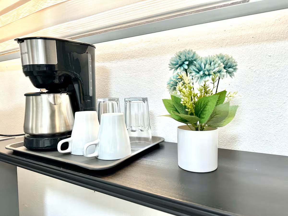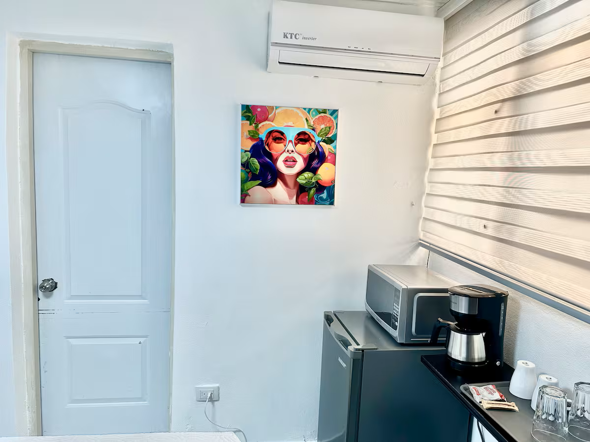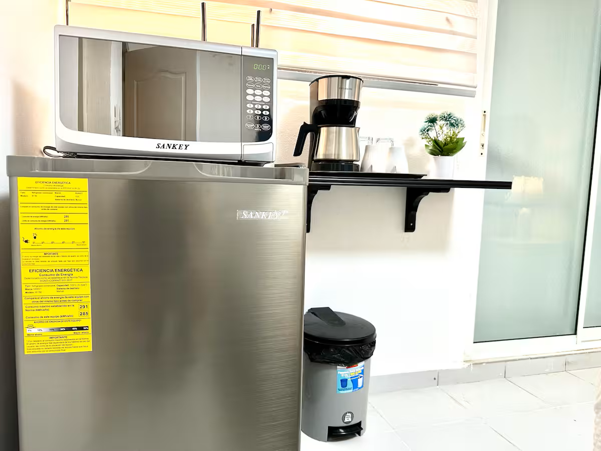 Cocina equipada con microondas, nevera y cafetera (no incluye horno)