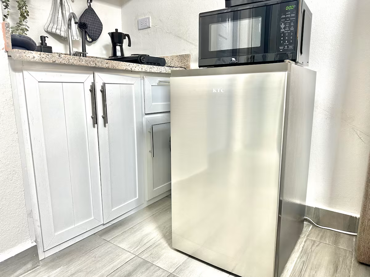 • Cocina equipada: nevera, microondas, cafetera, tostadora, licuadora, horno y utensilios básicos